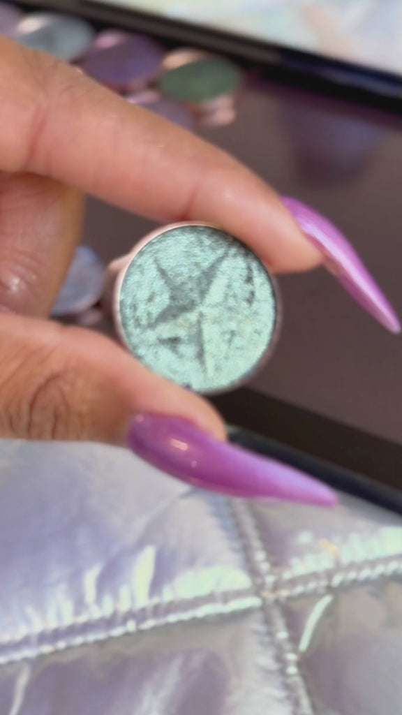 A soft silvery-mint shimmer that glows with icy aqua and pearl tones. Its silky finish catches the light like moonlit satin — delicate yet striking.